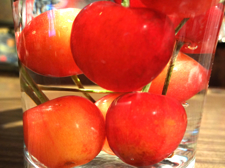 残った さくらんぼを グラスに 水と共に 入れたら こうなりました